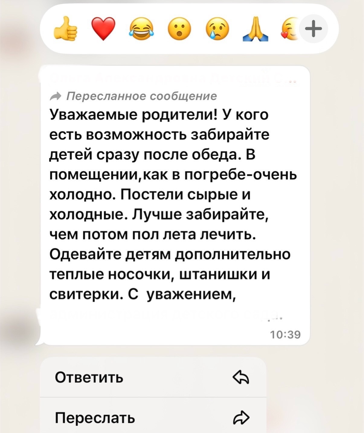 "Если у вас есть возможность, пожалуйста, забирайте детей сразу после обеда. В помещениях очень холодно, постели сырые, и лучше предотвратить болезни, чем лечить их летом.Не забывайте дополнительно одевать детей: теплые носочки, штанишки и свитерки обязательно!" - пишут в родительских чатах!